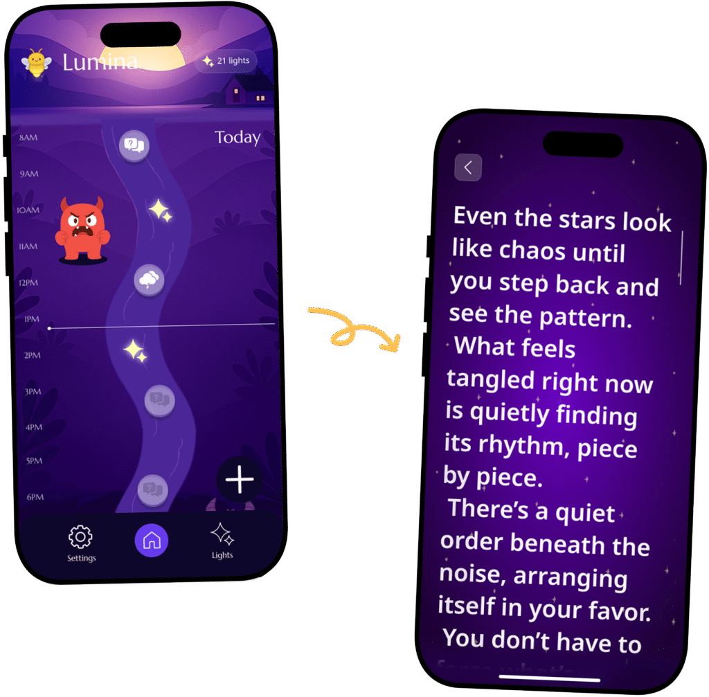 Watch Demo Get motivated so you can keep going have a buddy in your pocket that will always know what to say to keep you motivated Why choose Lumina? Why choose Lumina? Learn to understand your inner monsters and use them to be your best self.